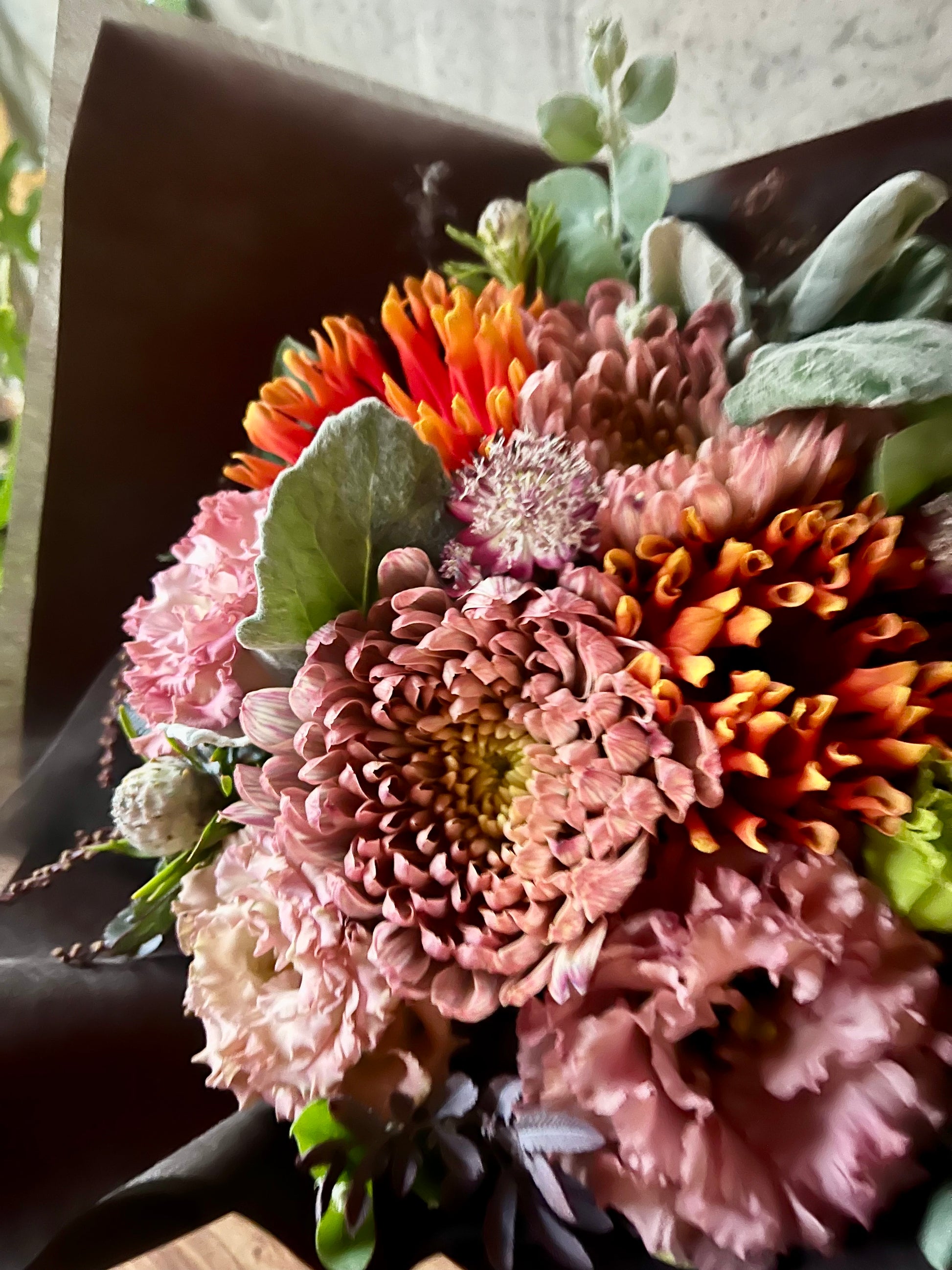 落ち着いたオレンジとシックなピンク系の花々を使った、ペットちゃんのためのお供えのアレンジメントです。大切なペットちゃんと飼い主様の絆を繋いでくれるはず。色とりどりの優しげな花が、飼い主様の心にそっと寄り添います